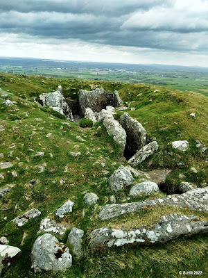 As stated Carnbane East is the most interesting and so that is where we headed on a quite breezy but sunny morning. The starting point to the hill was not hard to find and a small car park is provided. Our objective was not only to view the cairns but to gain access to the largest one, Cairn T. The key for this we procured from the coffee shop at Loughcrew Gardens a short distance away, which I would heartily recommend for refreshments. A refundable deposit of 50 euro is required or you can in lieu leave your driving licence. The gardens belong to the Loughcrew estate which was the seat of the Plunkett family and notably Saint Oliver Plunkett who was martyred in 1681. The family church, now in ruins, is a really worthwhile visit and is not far from the coffee shop. I covered this in a previous post (here).