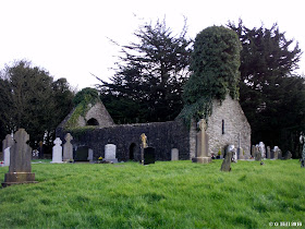 This picturesque little ruin lies near the village of Rush in North East Co Dublin. It is situated in an enclosed graveyard which local lore says has been a place of burial for over a thousand years. The Church dates to the late medieval period and has all four of its walls upstanding. The Western gable has a raised bellcote which is now ivy covered and there is an arched window in the East wall. The doorway is in the South wall but is gated and padlocked but it is possible to see some of the tombs within, one of which belongs to the Baron of Strabane and the other of the Palmer family late of Kenure House of which all that remains nearby today is the large Portico (see earlier post here )  There is a memorial plaque on the North wall of the Church recounting the many victims of Cholera in the area during the great famine. The Church is long out of use and is listed as being in ruins on the 1837 ordnance survey map although much earlier than this is more likely.